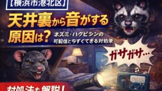 「夜、寝静まった頃に天井からカサカサと不気味な音がする……」 「ドスドスと重たい足音がして、天井が抜けないか不安で眠れない」 横浜市港北区にお住まいで、天井裏の「謎の物音」に悩まされていませんか? 実は港北区は、日吉や綱島周辺の歴史ある住宅...