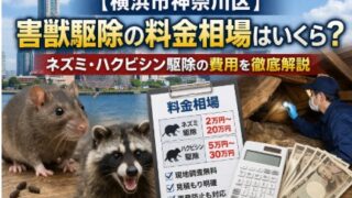 「ペスコンProって、ネットでよく見るけど実際どうなの?」 「神奈川区でハクビシンが出た……。高い料金を払って失敗したくない!」 横浜市神奈川区にお住まいで、天井裏の不気味な物音や、キッチンの隅に落ちている正体不明のフンに悩まされているあな...