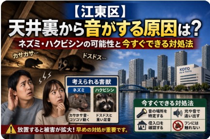 【江東区】天井裏から音がする原因は?ネズミ・ハクビシン・アライグマの可能性と家族を守る最速対処法を徹底解説